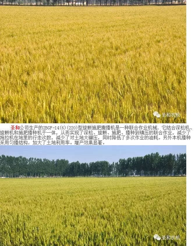 圣和公司生產(chǎn)的2BGF-14(6)(220)型旋耕施肥撒播機是一種聯(lián)合作業(yè)機械,它結(jié)合深松機、旋耕機和施肥播種機于一體,從而實現(xiàn)了深松、旋耕、施肥、播種到鎮(zhèn)壓的聯(lián)合作業(yè),減少了拖拉機在地里的行走次數(shù),減少了對土地大碾壓,同時降低了多次作業(yè)的油耗。另外本機播種采用勻播結(jié)構(gòu),加大了土地利用率。增產(chǎn)效果顯著。