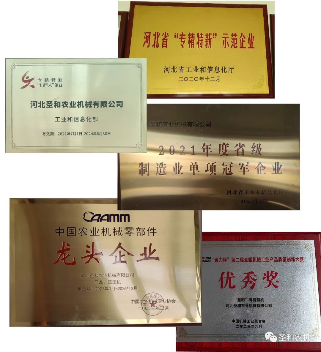 圣和公司為國家級專精特新“小巨人”企業(yè)、河北省“專精特新”示范企業(yè),2021年入選河北省民營企業(yè)社會責任100強企業(yè),河北省工業(yè)和信息化廳頒發(fā)的“2021年度省級制造業(yè)單項冠軍企業(yè)”。2022年圣和公司入選河北省首批縣域特色產(chǎn)業(yè)集群“領(lǐng)跑者”企業(yè)名單;2022年圣和牌旋耕機和還田機全國銷量第一;2023年中國機械工業(yè)聯(lián)合會第二屆全國機械工業(yè)產(chǎn)品質(zhì)量創(chuàng)新大賽圣和牌旋耕機榮獲“優(yōu)秀獎”;中國農(nóng)業(yè)機械工業(yè)協(xié)會評選為2023-2026年度“中國農(nóng)業(yè)機械零部件龍頭企業(yè)”。