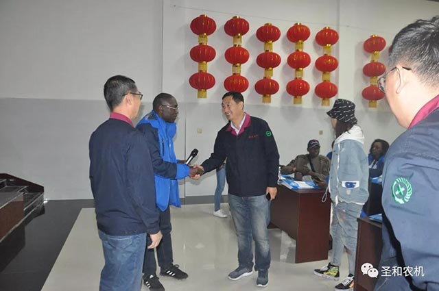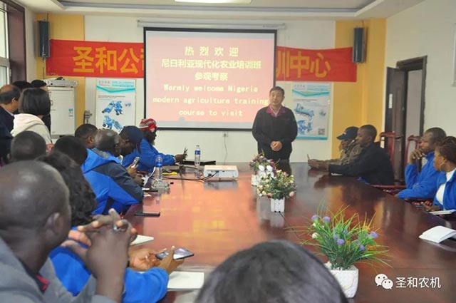 (10月24日)尼日利亞農(nóng)場院及部分政府人員組織現(xiàn)代化農(nóng)業(yè)培訓(xùn)班來河北圣和農(nóng)業(yè)機械有限公司參觀學(xué)習(xí),公司董事長王新芳、總經(jīng)理師西峰及常務(wù)副總經(jīng)理蘇山嶺帶領(lǐng)團隊熱情接待,并在公司會議室交流探討,公司董事長王新芳致歡迎詞,介紹了企業(yè)概況、發(fā)展理念和發(fā)展目標(biāo),圣和公司正以優(yōu)異的產(chǎn)品邁向現(xiàn)代化、國際化。