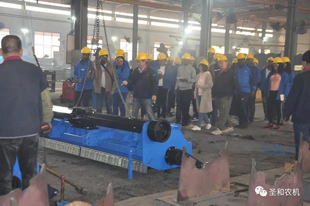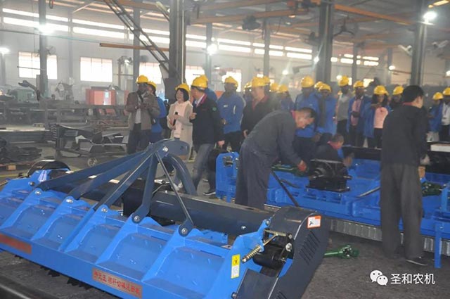 之后,參觀車間生產(chǎn)制造工藝,在過程中講解每一個生產(chǎn)制作環(huán)節(jié),對旋耕機、還田機等多種機具的工作原理、效果與土地適用性作出講解,參觀完畢后客人對圣和公司生產(chǎn)工藝與產(chǎn)品給予高度肯定。