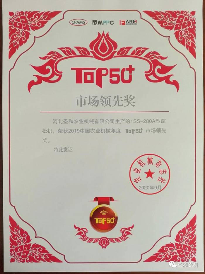 9月27日,2020年第八屆中國農機高端論壇(CAIF 2020)暨 2019 中國農業(yè)機械年度 TOP50+頒獎盛典”在北京舉辦。大會期間圣和公司產品1SS-280A型深松機榮獲“市場領先獎”。