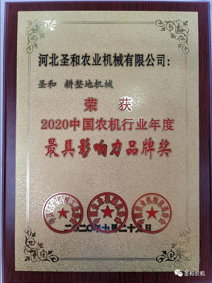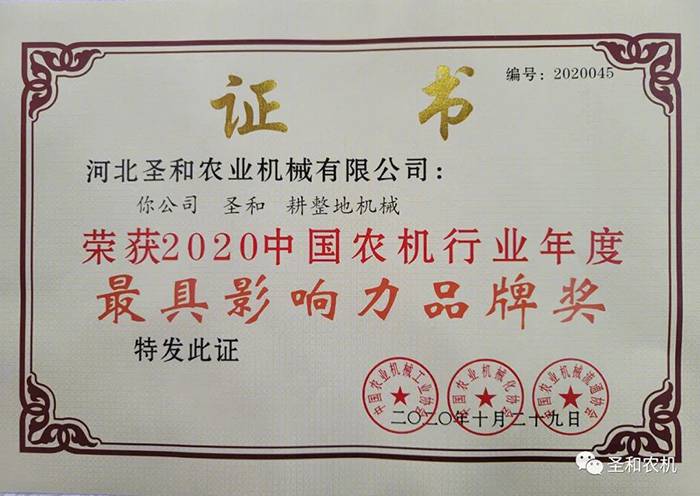 11月13日,“2020中國農機行業(yè)年度大獎頒獎儀式”在青島世界博覽城國際會展中心舉辦,河北圣和農業(yè)機械有限公司“圣和”品牌榮獲最具影響力品牌獎,也是全國農機行業(yè)耕整地機械類唯一獲獎企業(yè)品牌。
