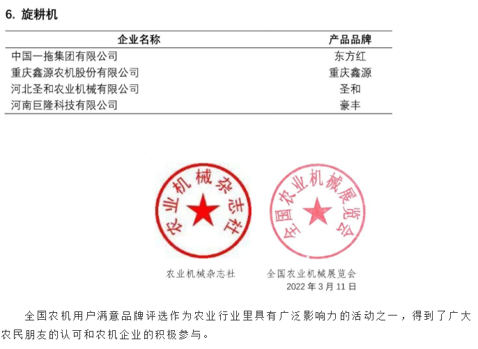 圣和品牌入選“旋耕機”類產(chǎn)品,榮獲第十四屆全國用戶滿意品牌。
