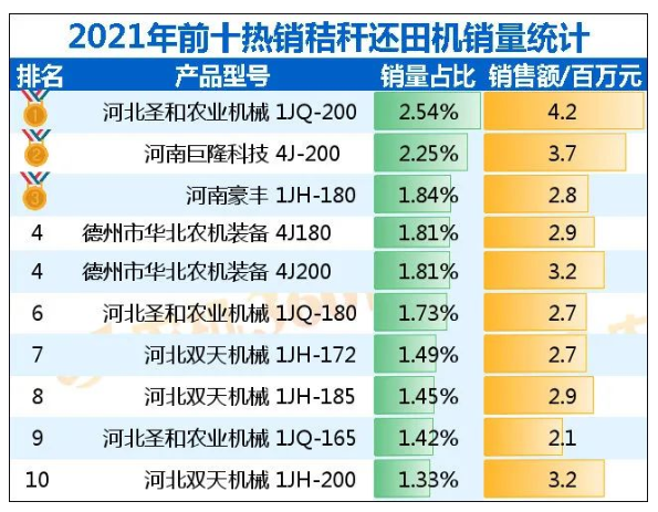 前十大暢銷秸稈粉碎還田機(jī)銷售3405臺(tái),占總銷量的15%。