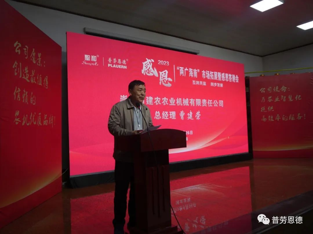 廣西崇左市建農(nóng)農(nóng)業(yè)機(jī)械有限責(zé)任公司總經(jīng)理曾建榮作為經(jīng)銷商代表進(jìn)行了發(fā)言。曾總分析了廣西農(nóng)業(yè)種植結(jié)構(gòu)和農(nóng)機(jī)市場(chǎng),希望圣和公司憑借其強(qiáng)大的公司實(shí)力和研發(fā)能力,開發(fā)出適合當(dāng)?shù)馗鞯男缕窓C(jī)具,以填補(bǔ)市場(chǎng)空白。