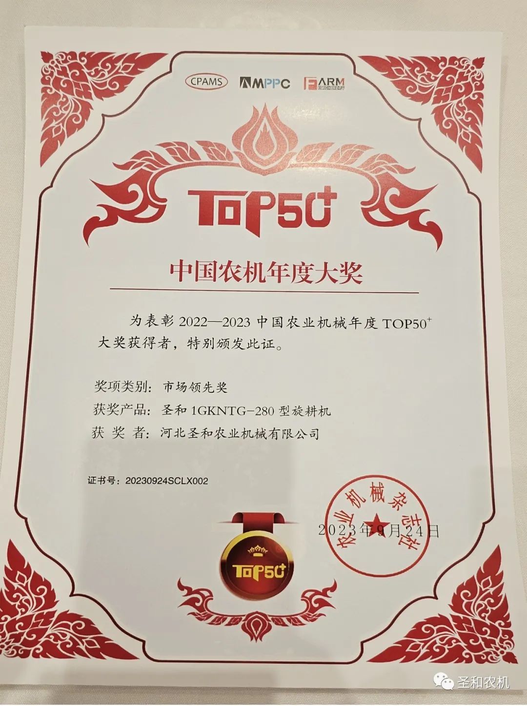 昨日,喜報又傳,在由中國農(nóng)業(yè)機(jī)械工業(yè)協(xié)會、中國農(nóng)業(yè)機(jī)械學(xué)會、《農(nóng)業(yè)機(jī)械》雜志社共同舉辦的第十一屆中國農(nóng)業(yè)機(jī)械高端論壇暨2023中國農(nóng)業(yè)機(jī)械年度TOP50+頒獎典禮上,河北圣和農(nóng)業(yè)機(jī)械有限公司在連續(xù)多年獲得TOP50+年度大獎的基礎(chǔ)上,“圣和1GKNTG-280旋耕機(jī)”憑借遙遙領(lǐng)先的市場表現(xiàn)與客戶高度認(rèn)可的可靠品質(zhì),實力加冕最具重量級獎項——“市場領(lǐng)先獎”,充分彰顯了圣和旋耕機(jī)家族的冠軍實力,行業(yè)地位再獲認(rèn)可。